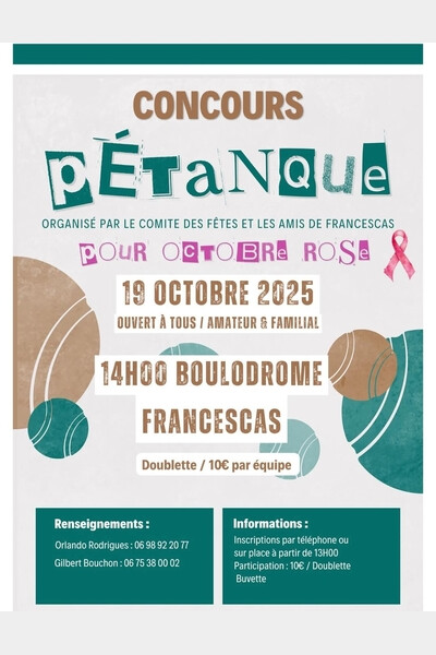 publi-information le dimanche 19 octobre 2025 à 14h19/10/2025 à 14h Concours de Pétanque à partir de 14h00 Payant Doublette : 10 €/par équipe