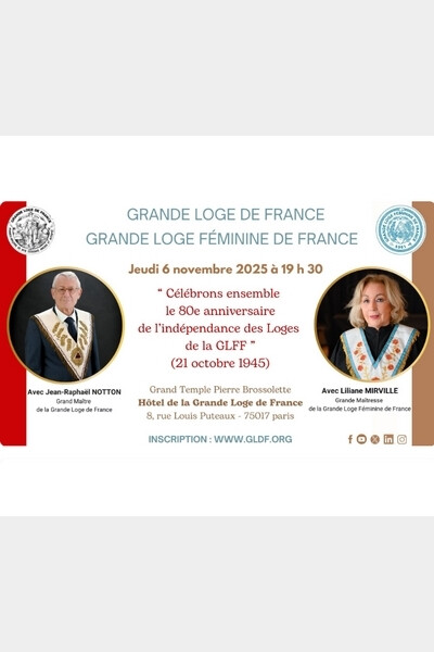 À l’occasion de son 80ᵉ anniversaire, la Grande Loge Féminine de France (GLFF) s’associe à la Grande Loge de France (GLDF) pour une conférence publique exceptionnelle, symbole d’un dialogue historique et fraternel.