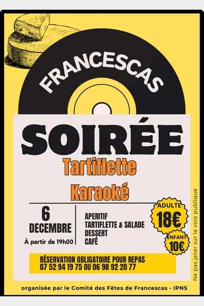 publi-information le samedi 6 décembre 2025 à 19h06/12/2025 à 19h Soirée Karaoké Tartiflette Karaoke avec repas sur réservations apéritif Tartiflette + salade Dessert Café 19h00 Payant 18€ adultes 10 € enfants