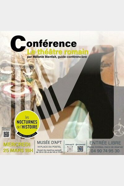 Pour sa troisième participation aux Nocturnes de l’Histoire, le musée d’Apt vous invite à une conférence participative sur le thème du théâtre romain. Elle abordera aussi bien l’architecture que les pièces qui y étaient jouées, leurs acteurs et leurs auteurs, et le public qui y assistait.