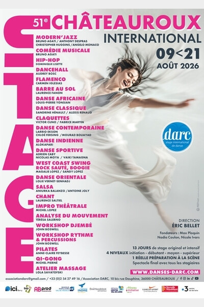 Du 09 au 21 août 2026, plus de 650 stagiaires de tout âge et du monde entier (Europe, Japon, Chine, États-Unis, Afrique, etc...) viendront au Stage International de Danse – Chant – Comédie de Châteauroux.