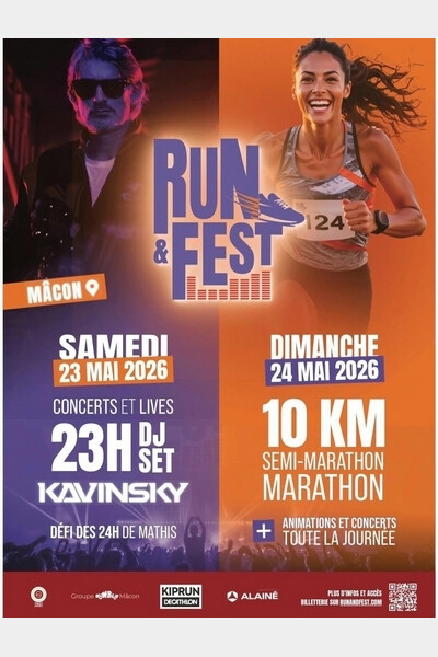 Les 23 & 24 mai 2026 à Mâcon, Run & Fest signe sa 1ère édition et bouscule les formats traditionnels avec un événement inédit en France : un festival du mouvement mêlant courses officielles (10 km, semi, marathon), concerts, performances artistiques et tentative de record de France des 24h sur tapis roulant.