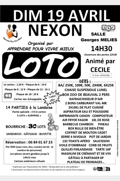 L'association Apprendre Pour Vivre Mieux vous invite à venir le 19 avril 2026 à la salle Georges Mélies à Nexon où aura lieu son loto avec de nombreux lots et bons d'achats.