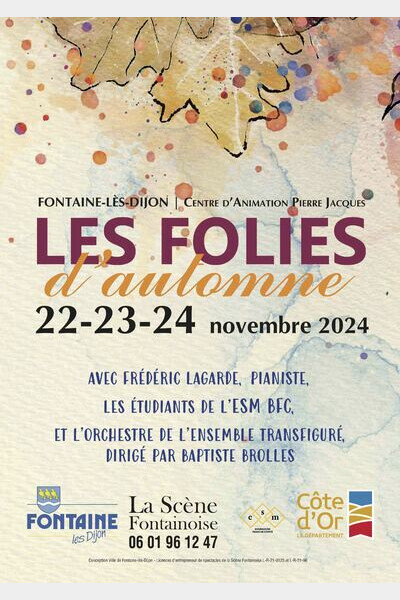Bienvenue aux " Folies d'Automne", 22-23-24 novembre 2024 un festival de musique proposé par la Scène Fontainoise, en partenariat avec la ville de Fontaine-lès-Dijon - des étudiants de l'École Supérieure de Musique de Bourgogne Franche-Comté interpréteront au Centre d’Animation Pierre Jacques des œuvres célébrant le mouvement, le rythme et l'émotion de la danse : florilège de palettes sonores des plus variées avec cuivres, bois, cordes, percussions, piano, accordéon sans oublier la voix :