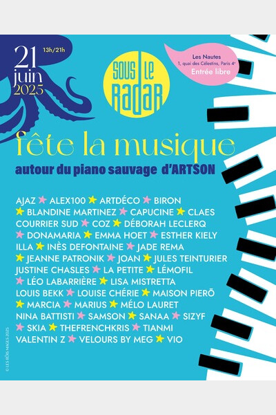 De 13h à 21h, ces artistes se relaieront autour du piano sauvage d’ARTSON pour offrir au public huit heures de concerts non-stop mêlant piano-voix, chansons originales et collaborations inédites.