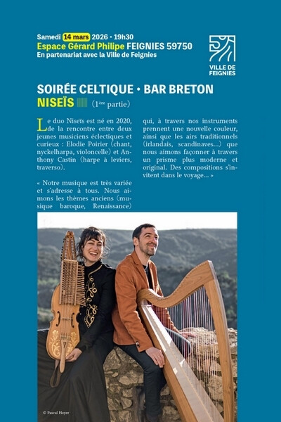 Le duo Niseïs est né en 2020, de la rencontre entre deux jeunes musiciens éclectiques et curieux : Elodie Poirier (chant, nyckelharpa, violoncelle) et Anthony Castin (harpe à leviers, traverso).