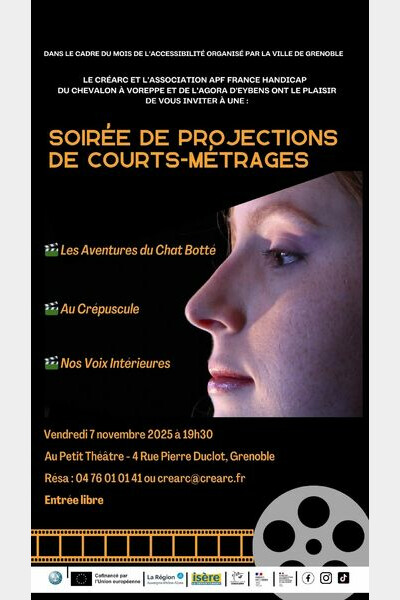 Dans le cadre du Mois de l’Accessibilité organisé par la Ville de Grenoble, le Créarc et l’Association APF France Handicap du Chevalon à Voreppe et de l’Agora d’Eybens ont le plaisir de vous inviter à une soirée de projections de courts-métrages.