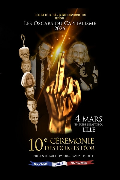 La Cérémonie des Doigts d’Or – Les Oscars du Capitalisme est une remise de prix satirique, qui consiste en une rétrospective des séquences cultes de l’année, entremêlée de discours décomplexés prouvant que tout va pour le mieux dans le meilleur des mondes… surtout pour nous, les plus riches de la planète !