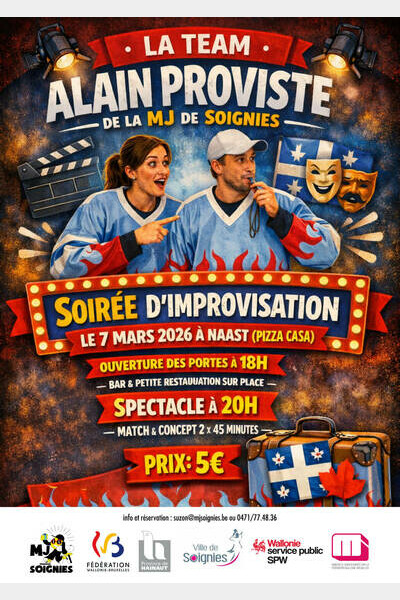 publi-information le samedi 7 mars 2026 à 18h07/03/2026 à 18h Spectacle d'improvisation ouverture des portes à 18h spectacle à 20h Payant 5€ (les bénéfices seront versés au projet Quebec)