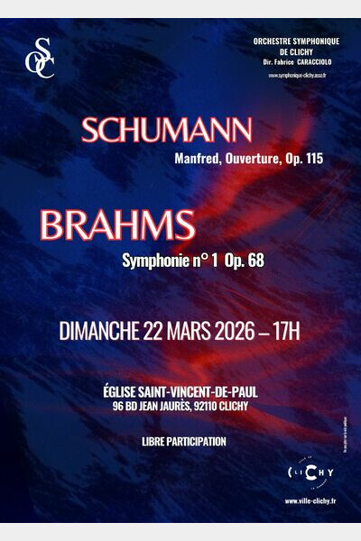 L'Orchestre Symphonique de Clichy, direction Fabrice Caracciolo, a le plaisir de vous annoncer son prochain concert qui aura lieu Dimanche 22 Mars 2026 à 17h, en l'Eglise St Vincent de Paul à Clichy.