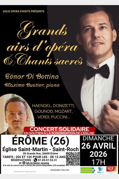 Le Ténor Di Bettino et son pianiste Maxime Buatier vous donnent rendez-vous à Erôme (Eglise Saint-Martin Saint-Roch) pour "Grands Airs d'Opéra et Chants Sacrés", le dimanche 26 avril 2026 à 17h.